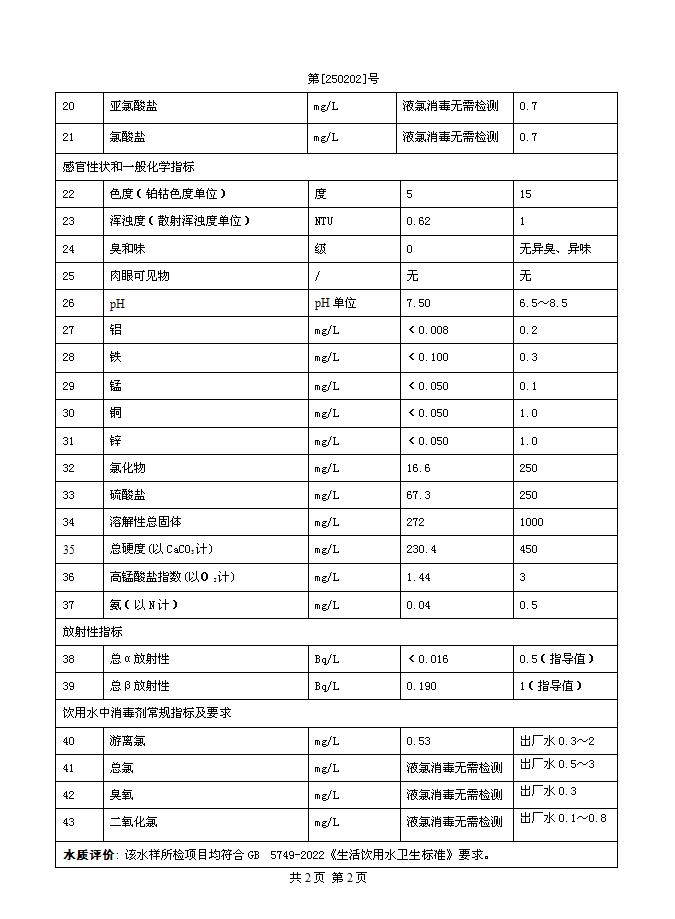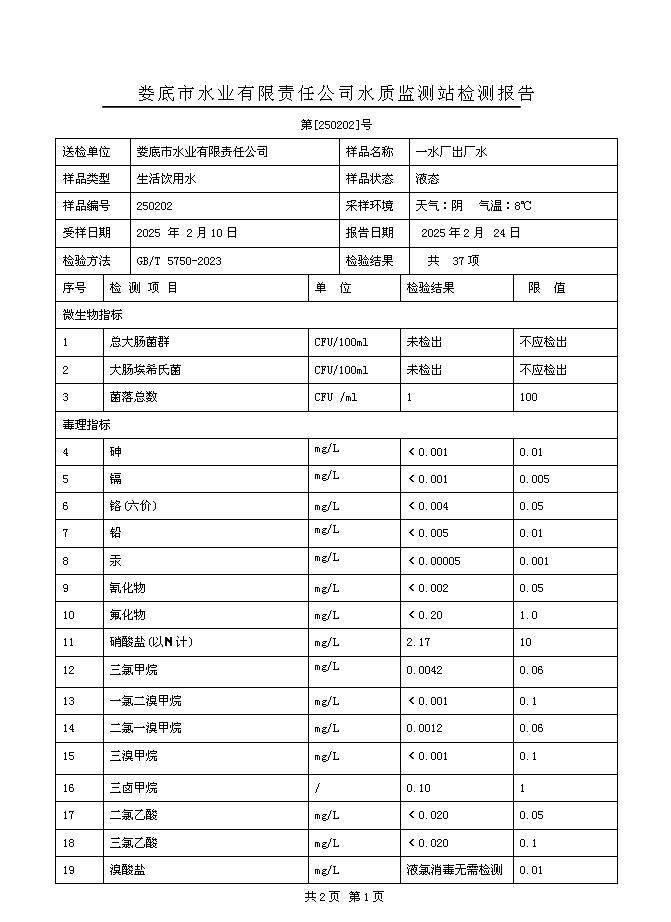2025年2月一水廠出廠水水質(zhì)公告